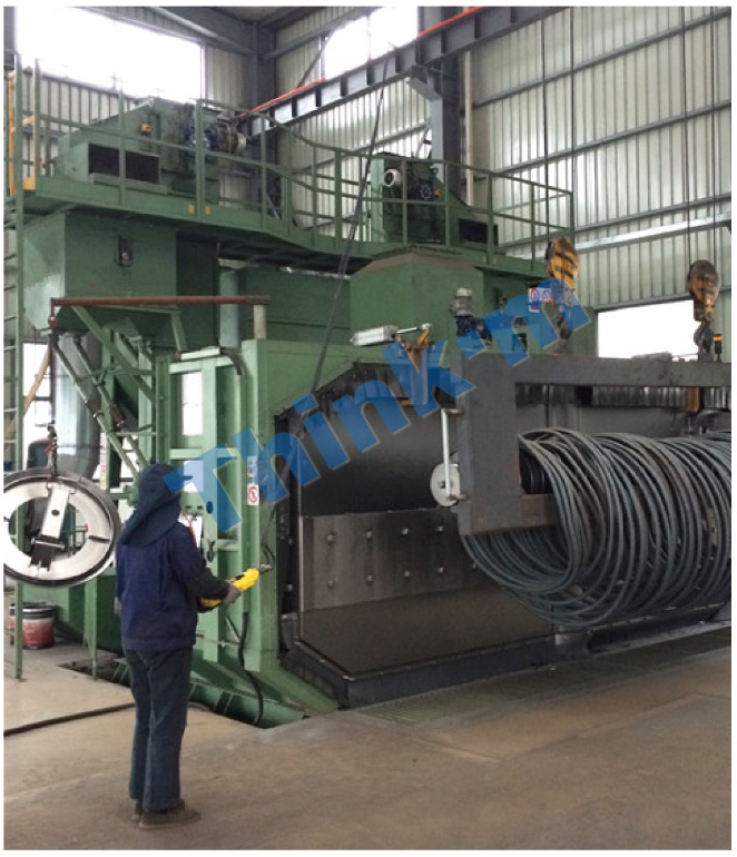 盘圆的抛丸请理,是利用高速抛出的铜丸,将线材表面的铁锈、氧化皮等去除。本机采用独特的双芯轴单门原地旋转设计,芯轴表面按特定规律分布了特定数量的凸台,大门关闭后通过芯轴的旋转及正反转,将盘卷均匀展开并使上下起伏振动,使盘卷得到全面抛射,消除抛射死角。为了有效利用弹丸,为了使弹丸全面覆盖盘卷,本机设计时利用CAD仿真模拟,用最优化方式布置Thik高效抛丸器,全面清理盘圆的内、外侧面及圆周表面。